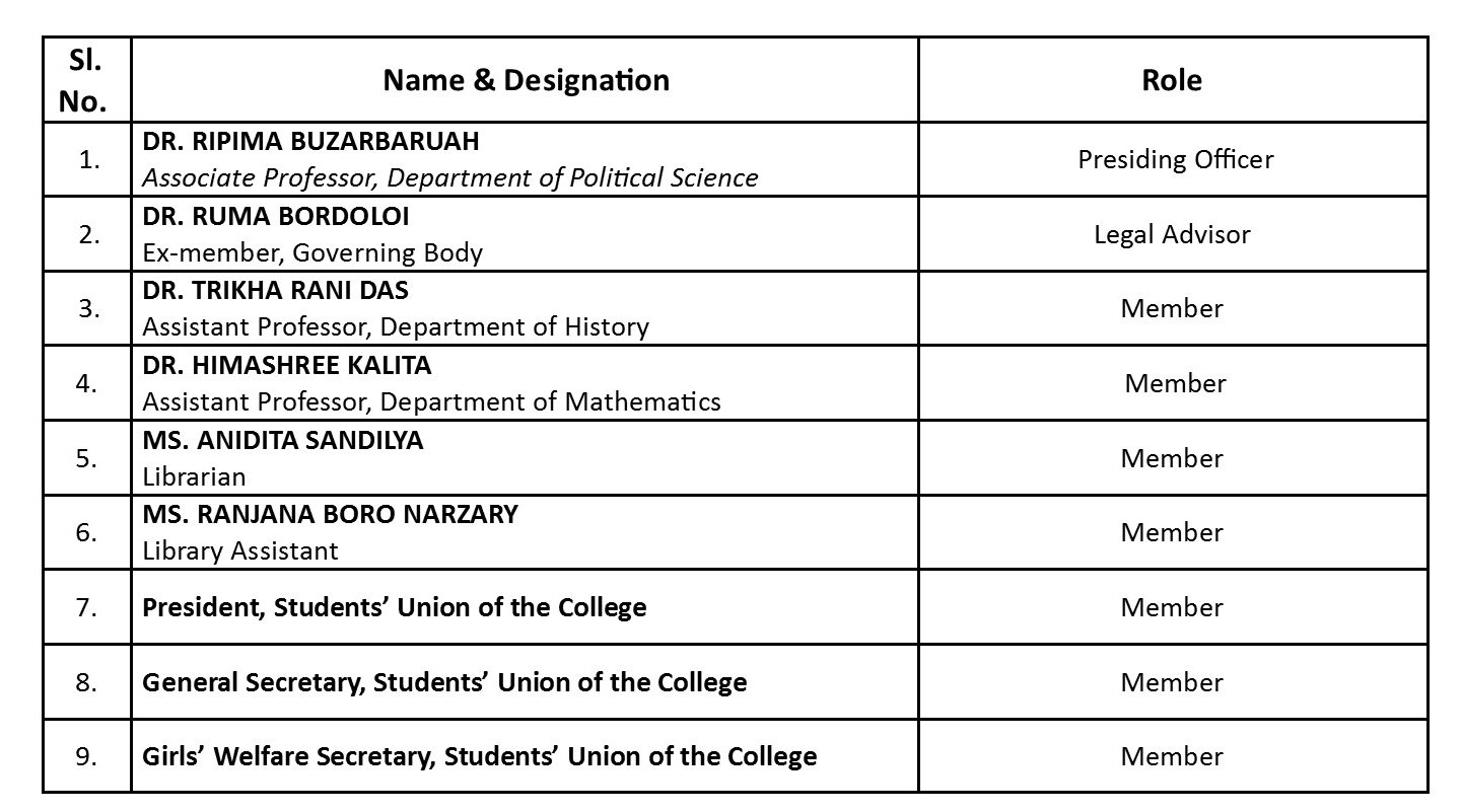 Suren Das College is committed to providing safe, academic and working environment to all students and its women employees. In pursuance to the guidelines of the Hon'ble Supreme Court, University Grants Commissions, Sexual Harassment of Women at Workplace (Prevention, Prohibition and Redressal) Act 2013, an Internal Complaints Committee has been established by the college.